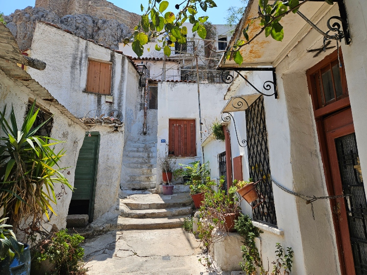 De repente, mientras avanzas entre callejuelas estrechas, el ambiente cambia por completo, casitas blancas, ventanas de colores, plantas trepando por las paredes y ese silencio que recuerda a los pequeños pueblos de las islas Cícladas. Es como un pequeño viaje en el tiempo y un descanso del bullicio de la ciudad.