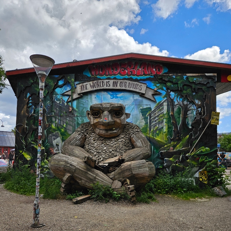 Uno de los lugares más curiosos y diferentes que puedes visitar en Copenhague es, sin duda, Christiania, también conocida como “la Ciudad Libre”. Este barrio nació en 1971, cuando un grupo de vecinos, artistas y personas con espíritu libre ocuparon una antigua zona militar abandonada. Desde entonces, se ha convertido en una comunidad autosuficiente con sus propias normas, su arte callejero y una identidad única.